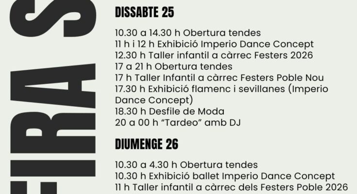 El dissabte 25 d’octubre, Dia del Comerç, la Fira SOC viurà una de les seues jornades més intenses. Les tendes estaran obertes de 10.30 a 14.30 h i de 17 a 21 h, amb una àmplia programació d’activitats. Al matí, hi haurà exhibicions de ball d’Imperio Dance Concept a les 11 h i a les 12 h, seguides d’un taller infantil a càrrec dels Festers 2026 a les 12.30 h. A la vesprada, els Festers del Poble Nou oferiran un taller infantil a les 17 h, i a les 17.30 h tornarà Imperio Dance Concept amb una exhibició de flamenc i sevillanes. A les 18.30 h arribarà el desfile de moda, i la jornada conclourà amb un animat “tardeo” amenitzat pel DJ Jesús Gimeno de 20 a 00 h.