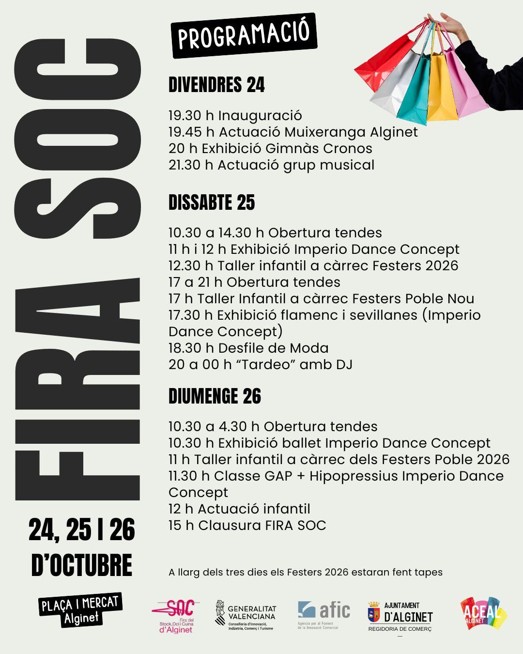 AAlginet es prepara per a un cap de setmana ple d’activitat amb la celebració de la Fira SOC, organitzada per la Regidoria de Comerç de l’Ajuntament d’Alginet. La cita s’inaugurarà demà divendres 24 d’octubre i s’allargarà fins al diumenge 26, coincidint amb el Dia del Comerç, que se celebrarà el dissabte 25 d’octubre. La plaça i el mercat cobert del municipi es convertiran en el centre neuràlgic de tres dies dedicats a impulsar el comerç local i oferir activitats per a tots els públics.
