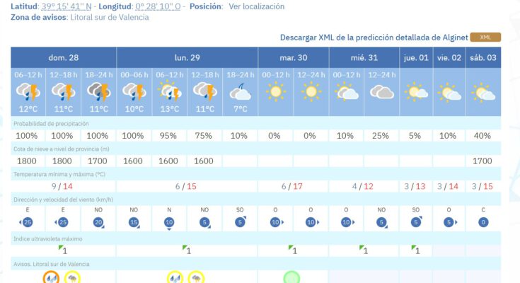 L’Agència Estatal de Meteorologia (AEMET) ha activat per a aquest diumenge 28 l’avís taronja per precipitacions a la zona, davant la previsió de pluges molt intenses en un curt període de temps.