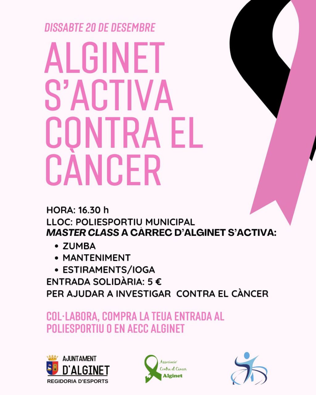 Alginet tornarà a mostrar el seu vessant més solidari amb la celebració d’una Classe magistral Solidària impulsada per Alginet S’Activa, amb la col·laboració de la Regidoria d’Esports i l’Associació Espanyola Contra el Càncer (AECC) d’Alginet. L’esdeveniment se celebrarà el dissabte 20 de desembre, a partir de les 16.30 hores, al Poliesportiu Municipal d’Alginet.