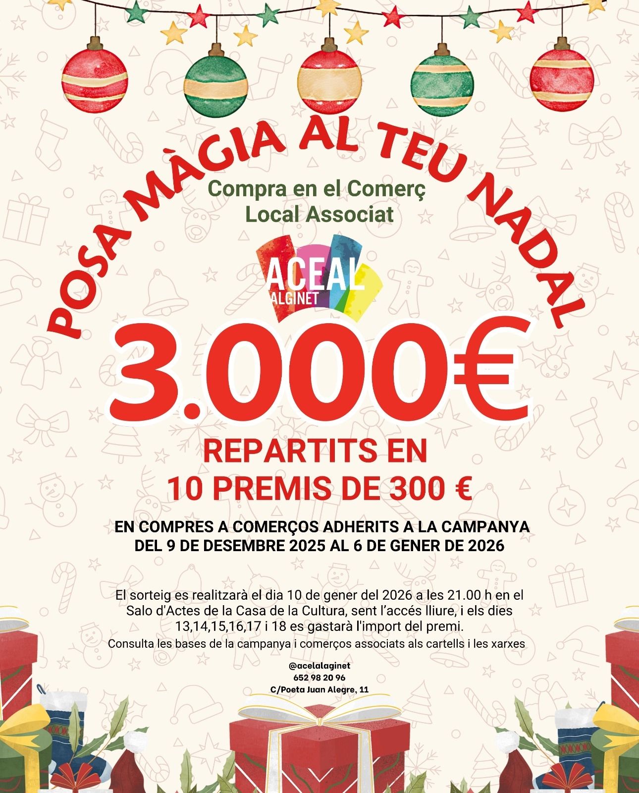 L’Associació Comercial i Empresarial d’Alginet posa en marxa hui, 9 de desembre, la tradicional Campanya de Nadal i Reis, una iniciativa destinada a incentivar les compres en el comerç local durant les festes. Baix el lema “Posa Màgia al Teu Nadal. Compra en el Comerç Local Associat”, la campanya es prolongarà fins al pròxim 6 de gener de 2026.