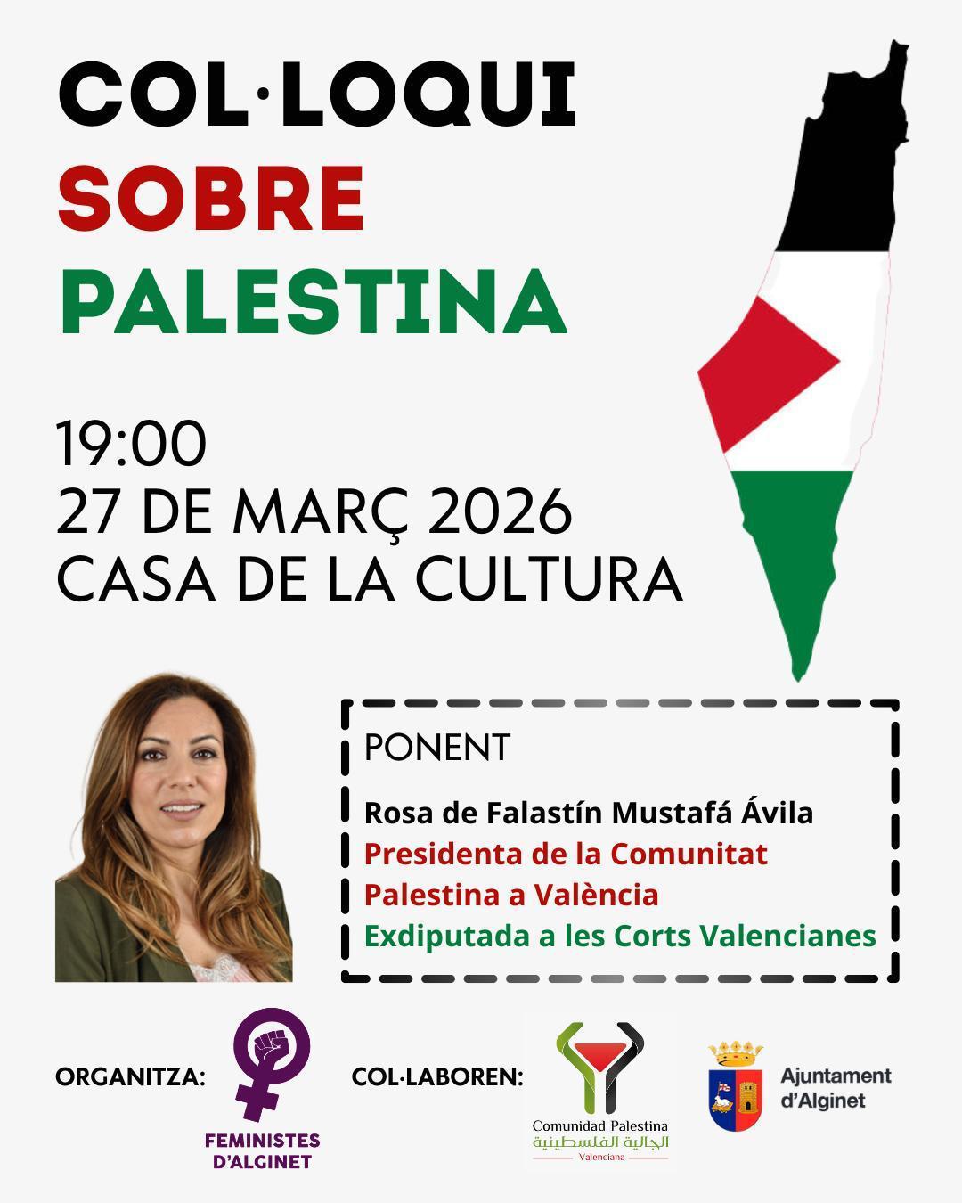 La Casa de la Cultura d’Alginet acollirà el pròxim 27 de març de 2026, a les 19.00 hores, un col·loqui sobre Palestina organitzat per Feministes d’Alginet, amb l’objectiu de generar un espai de reflexió i diàleg al voltant d’aquesta realitat d’actualitat.