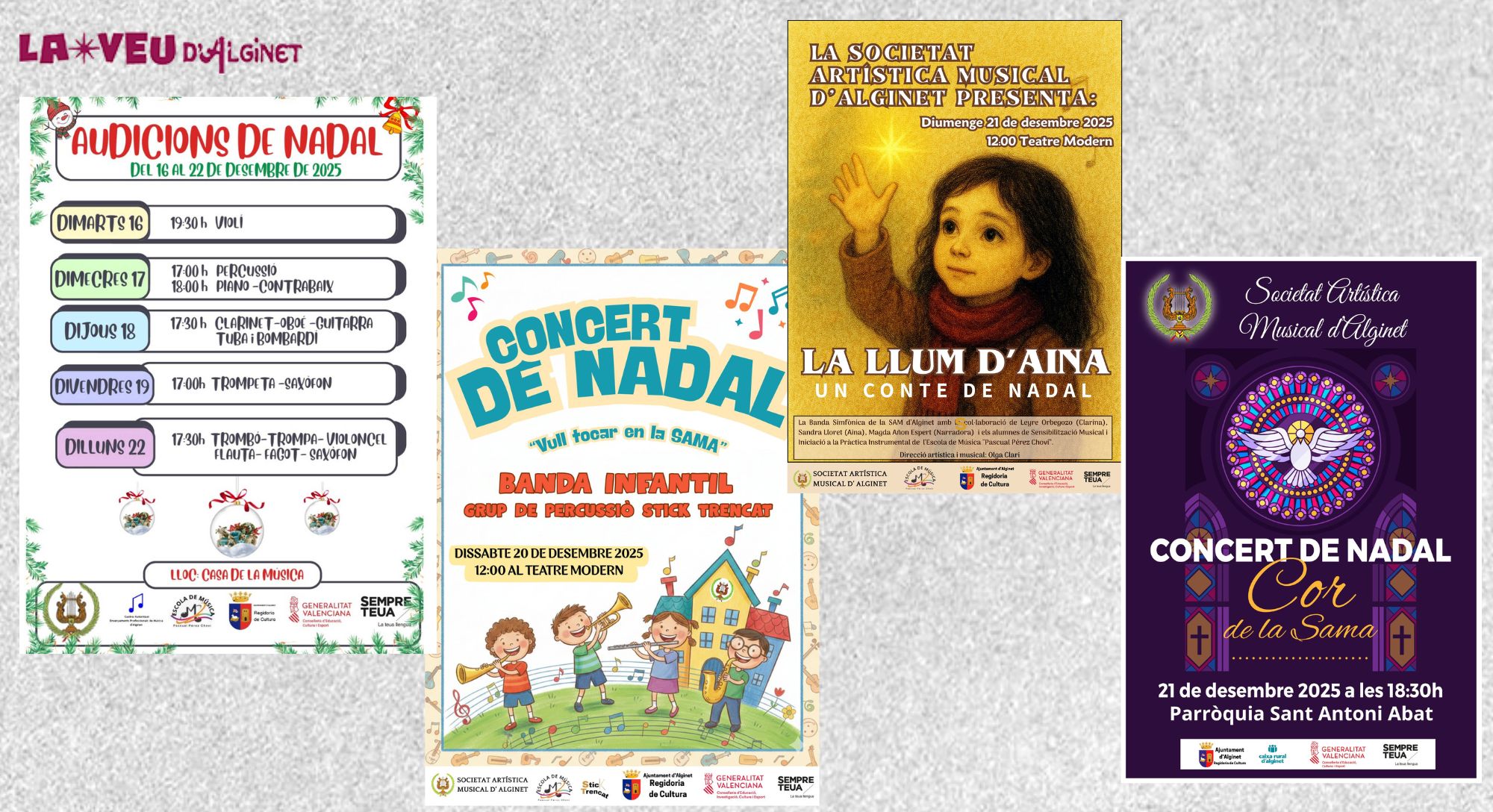 La Societat Artística Musical d’Alginet (SAMA) acomiadarà el 2025 amb una setmana repleta de música, formada per audicions i concerts que se celebraran del dimarts 16 al dilluns 22 de desembre. Una agenda que combina l’activitat formativa del Centre d’Ensenyaments Musicals amb les actuacions de les diferents agrupacions de la societat.