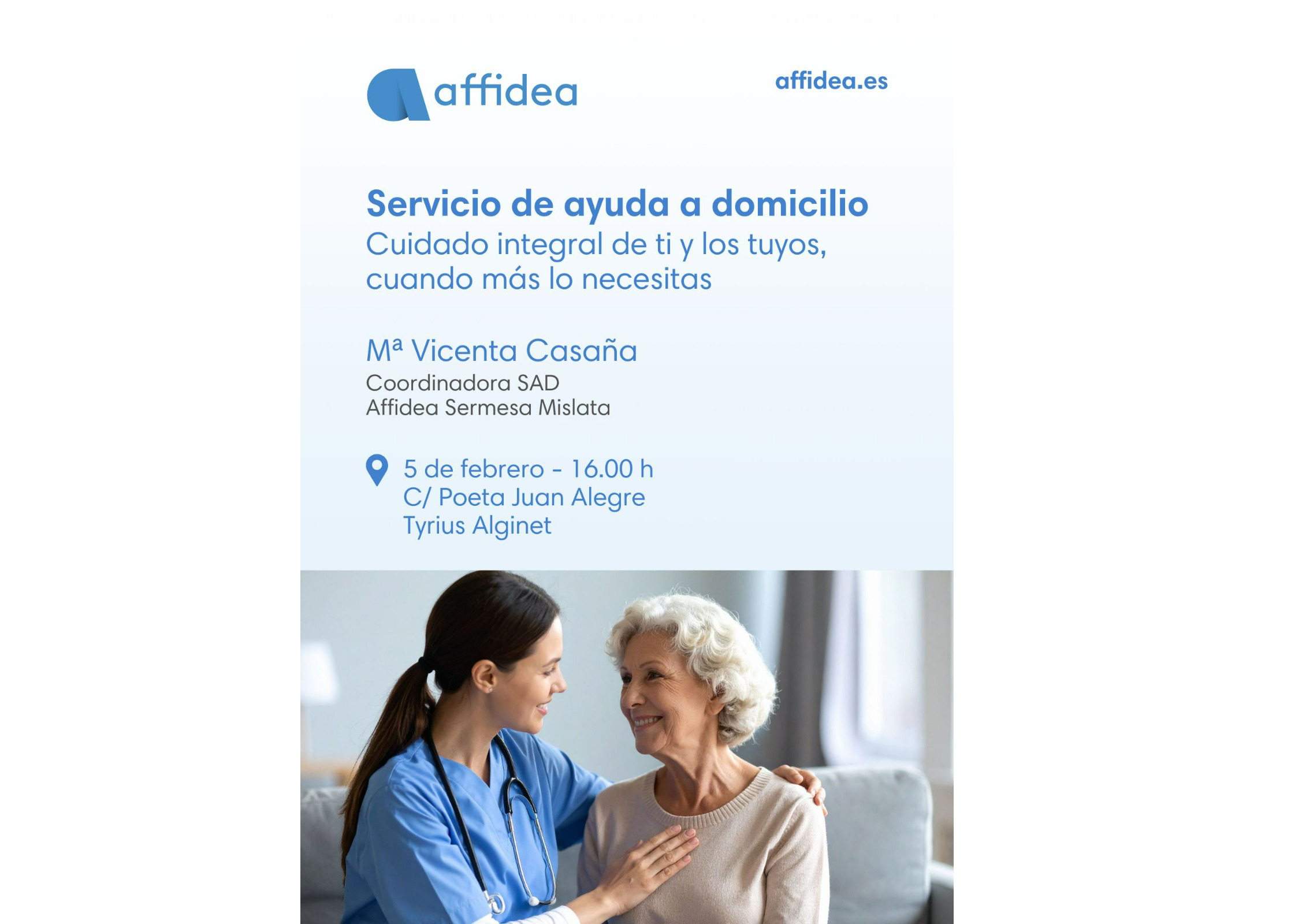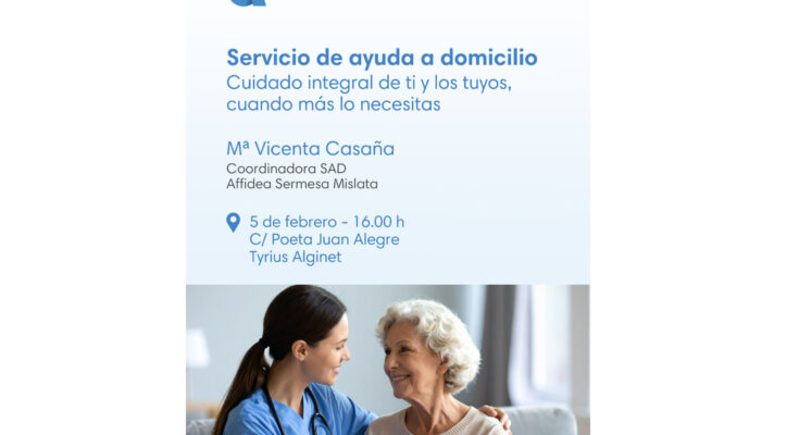 La sessió se celebrarà a les 16.00 hores al centre Tyrius d’Alginet, al carrer Poeta Juan Alegre, i estarà impartida per Mª Vicenta Casaña, coordinadora del Servei d’Ajuda a Domicili (SAD) d’Affidea Sermesa Mislata.