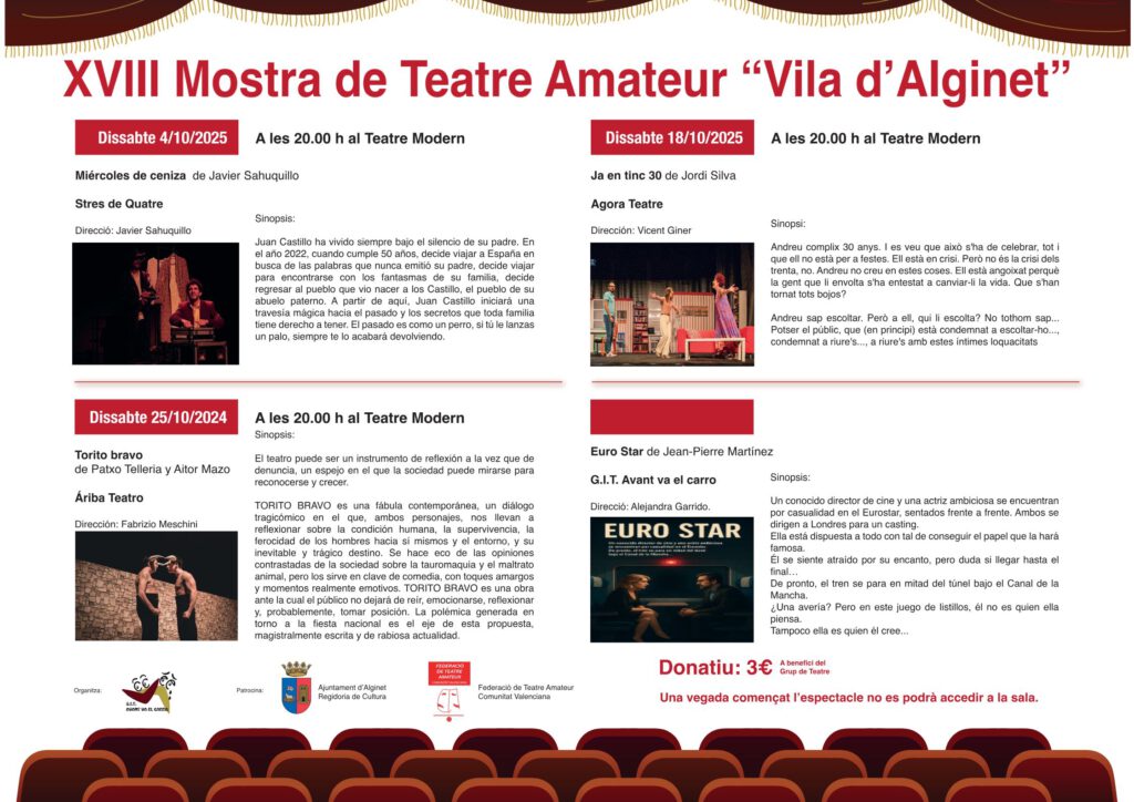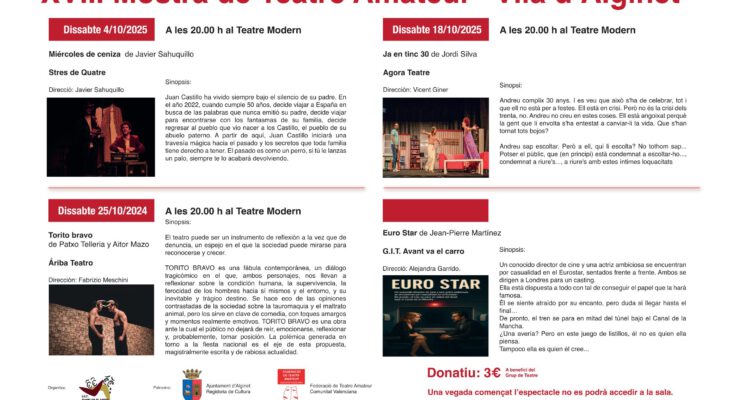 L’entrada a cada espectacle tindrà un donatiu simbòlic de 3 euros, que es destinarà íntegrament al suport i foment de l’activitat teatral a Alginet.